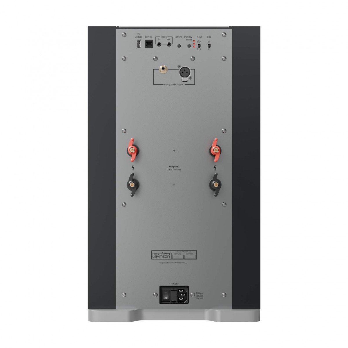 | Input & Output Connectors | One, balanced XLR input; One, single-ended RCA input; Two Pairs, “Mark Levinson Hurricane” loudspeaker output binding posts |